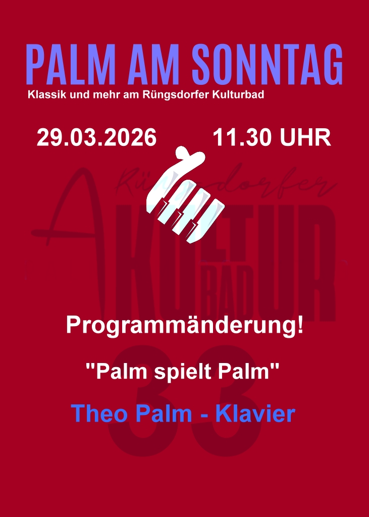 Wir haben uns entschieden, ab dem September für die Konzerte im Rahmen von „Palm am Sonntag“ einen Eintrittspreis von 12,00 Euro (Mitglieder 10,00 Euro) zu erheben. Während des letzten Konzerts habe ich die Gründe dafür ausführlich erläutert, und eine Umfrage bei den Besucherinnen und Besuchern zeigte eine breite Unterstützung dafür.